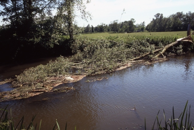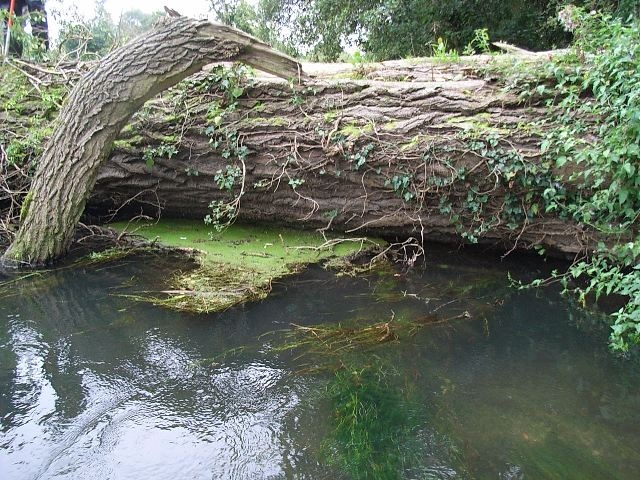 (Below). Although trees along the banks of rivers fall into the water after storms or by errosion for example.Woody debris can be put into the river to create new habitat for fishes, just so long as a few simple rules are followed. If done properly, woody debris will represent no flood risk and will provide esstnail shelter for fishes.