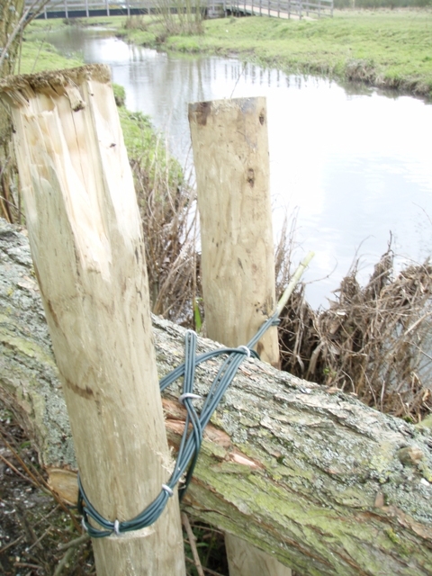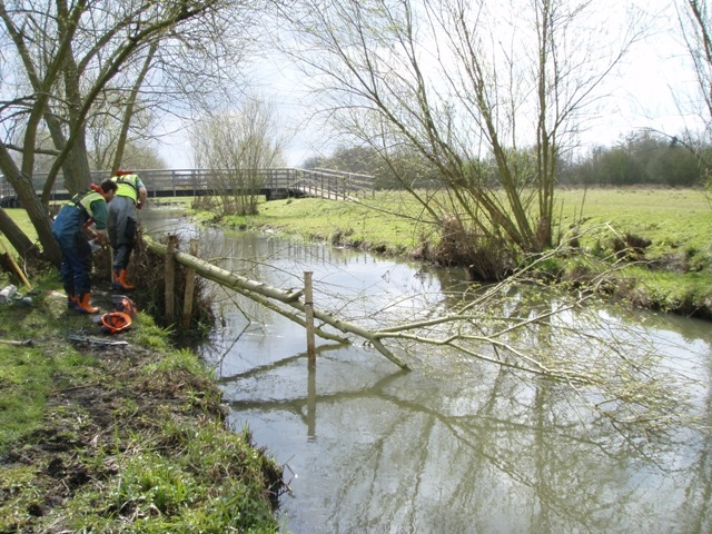 (Below). This tree has been firmly anchored and is not going anywhere. There is no risk of this providing a risk to bridges. This large piece of woody debris was created by felling tree and anchoring it to the bank. A living tree will survive and continue to grow, providing habitat for many species above and below water. Leaving the tree attached at the base will anchor it to the bank and ensure it carries on growing. Such extreme treatment may seem to be a bad way to treat a tree, but they soon recover and start growing again.