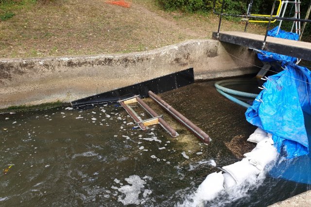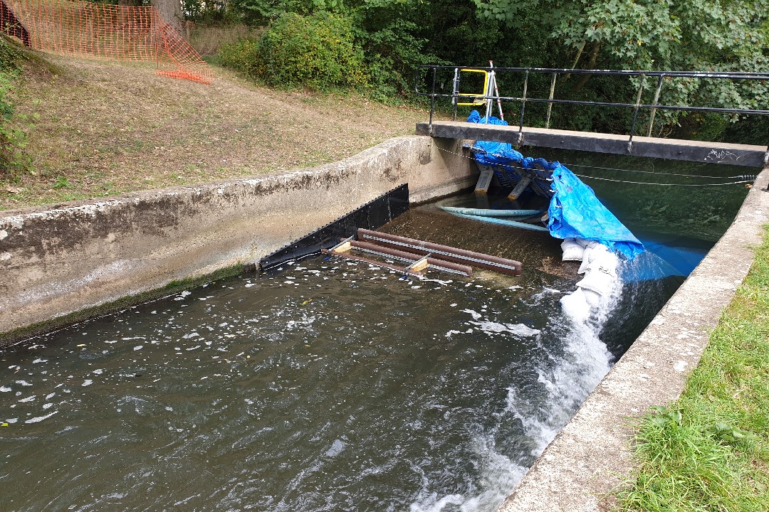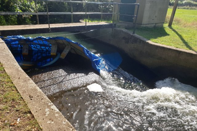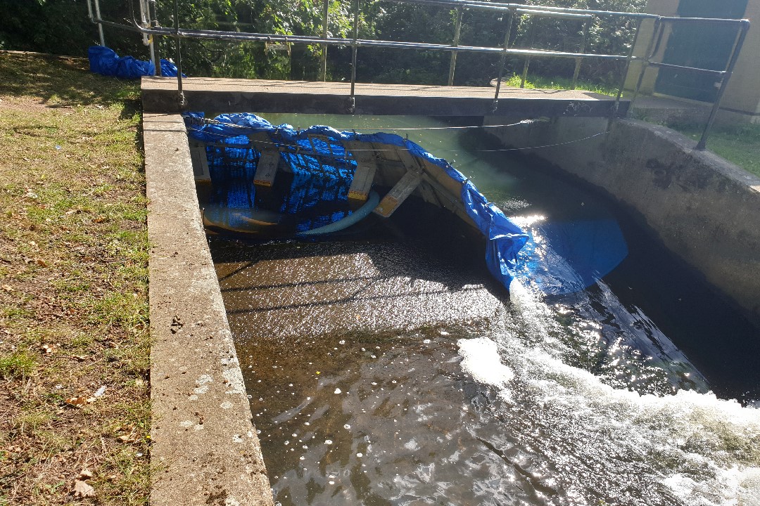 Putting the coffer dam in place to divert the flow to allow baffle installation