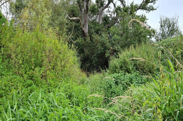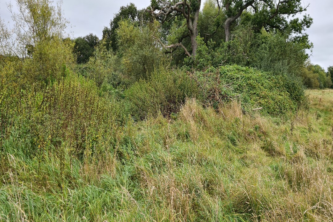 Lower section of the river bank that slopes down to the river to the left of the picture. The new backwater mouth will be in the center of this picture