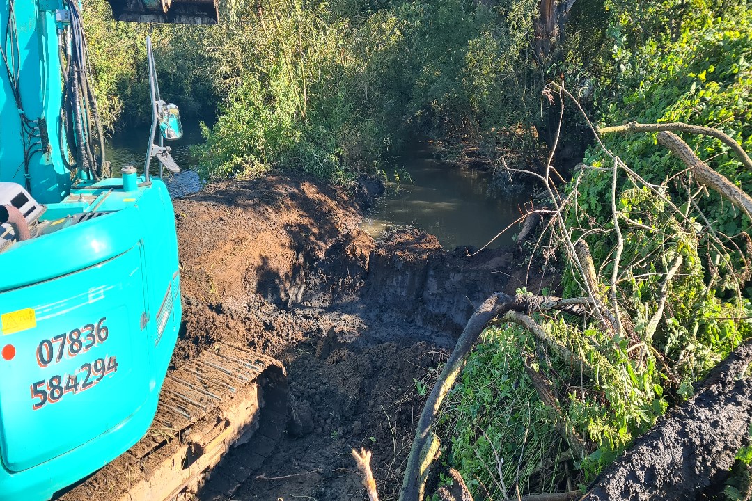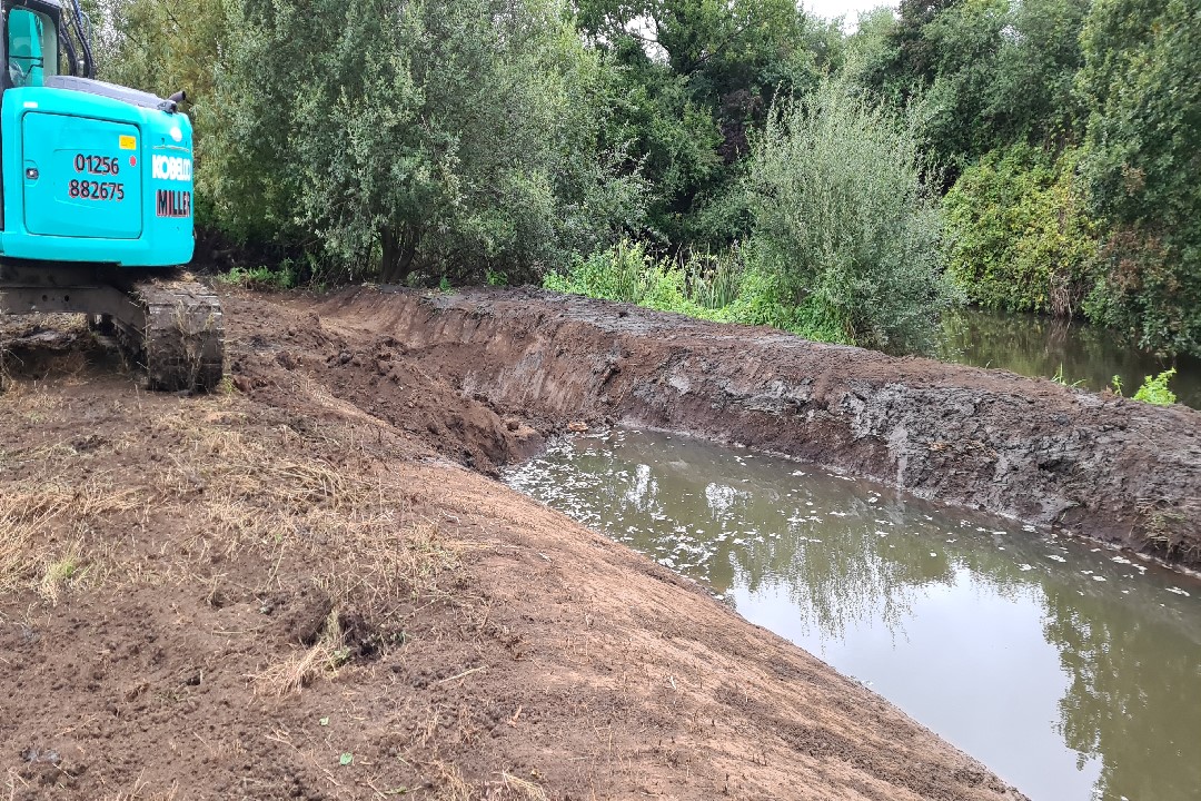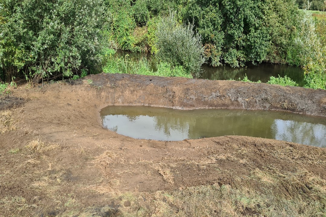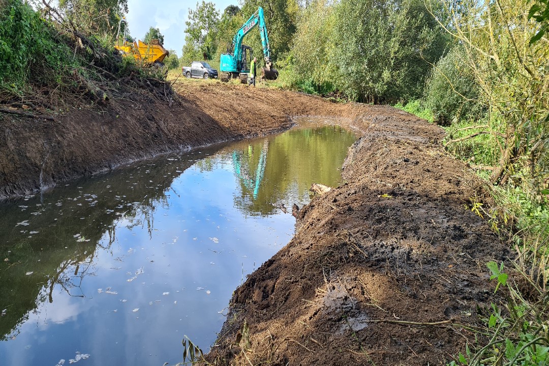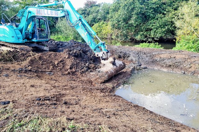 Working backwards from the mouth of the new backwater in sections. Each section was dug out and finished whilst the temporary "Dam" held the water back. The river water was let in gently to each section by removing the dam. This was done to prevent a large influx of water at the final stage.