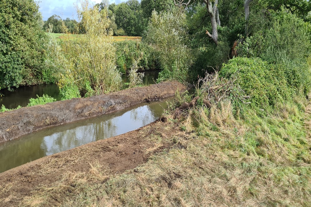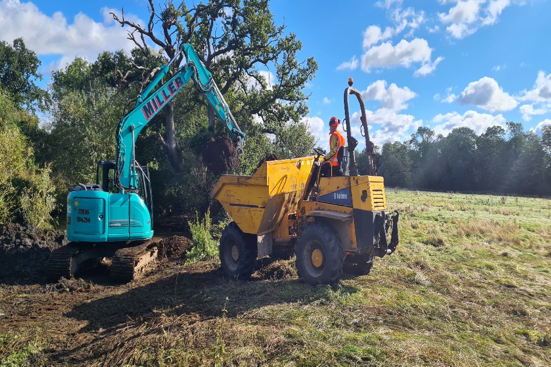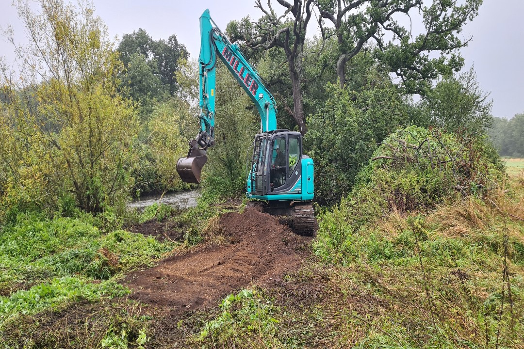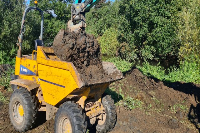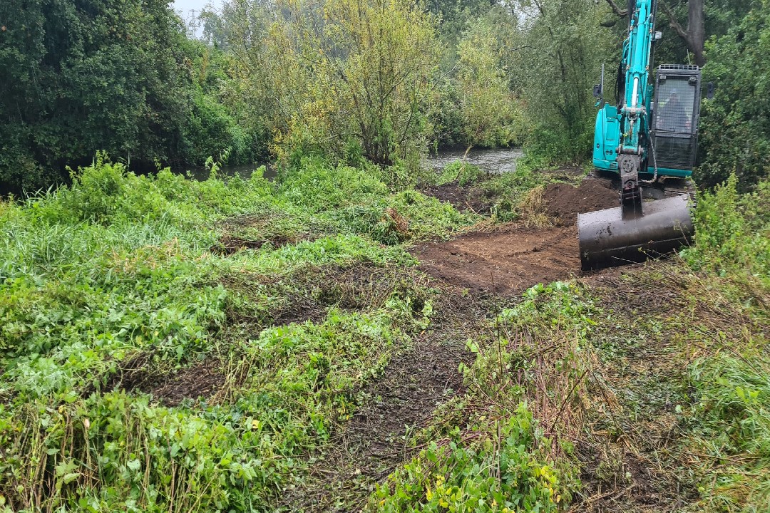 Working backwards from the mouth of the new backwater in sections. Each section was dug out and finished whilst the temporary "Dam" held the water back. The river water was let in gently to each section by removing the dam. This was done to prevent a large influx of water at the final stage.